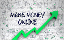 White Wall with Make Money Online Inscription and Green Arrow. Development Concept. Make Money Online Inscription on Modern Illustration. with Green Arrow and Hand Drawn Icons Around.